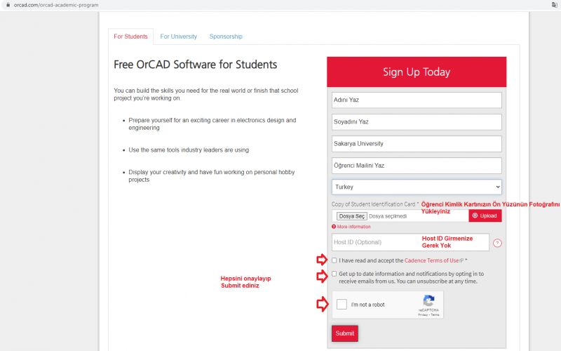 3) Formu doldurduktan sonra "submit" ediniz. Başvuru yaptıktan sonra, öğrencilerle bireysel olarak iletişime geçip, lisans çıkarma işlemlerine başlanacaktır.