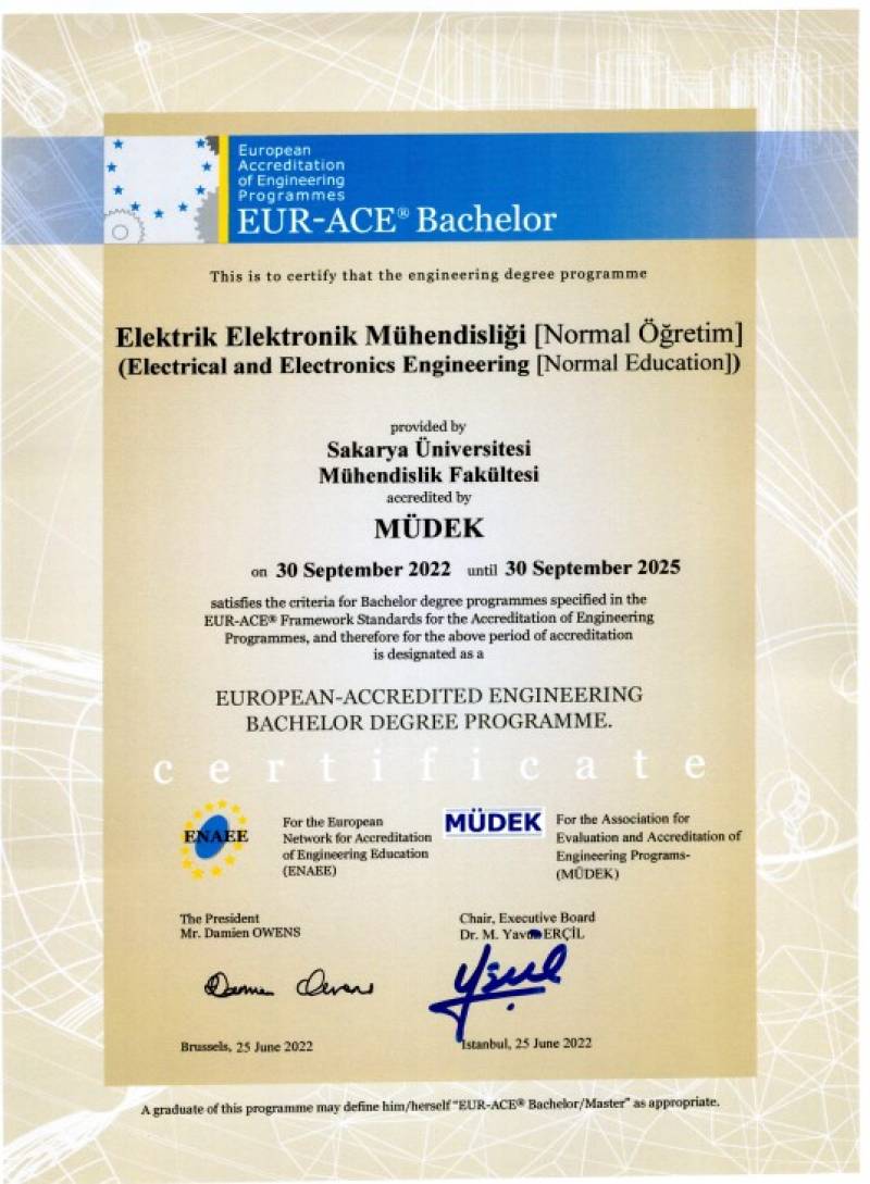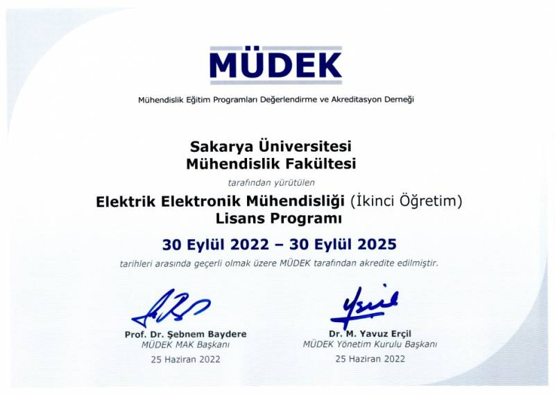 Bölümümüz 2010-2015 yılları arasında Müdek tarafından akredite edilmiş olup bölümümüzün akreditasyon yenileme çalışmaları kapsamında özdeğerlendirme raporlarımız hazırlanmış ve Müdek denetmenleri tarafından bölümümüze yapılan ziyaretler ve değerlendirmeleri sonucunda Müdek Akreditasyonu Geçerlilik Süresi ve EUR-ACE Etiketi Geçerlilik Süresi 30.09.2025 tarihi olarak güncellenmiştir.