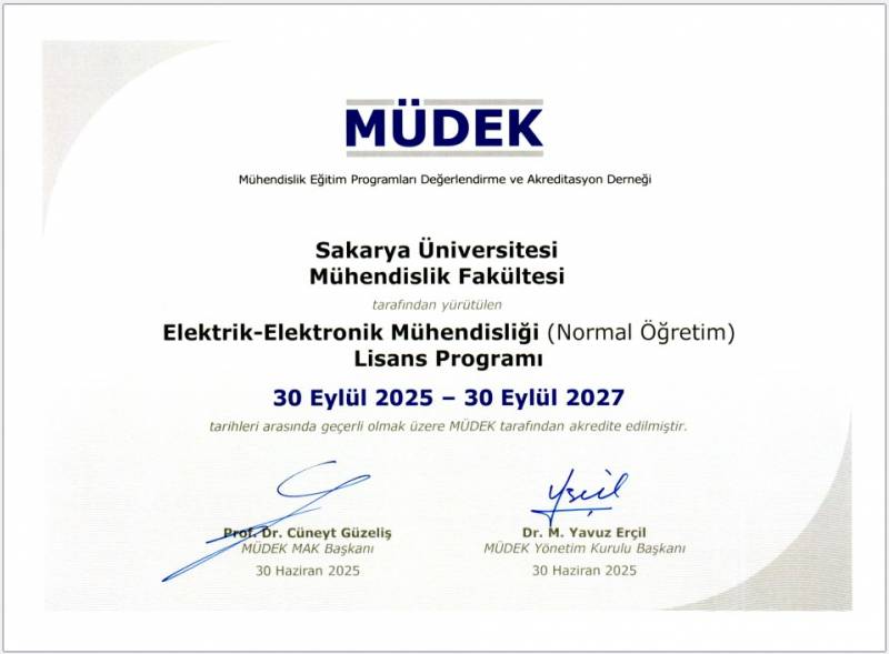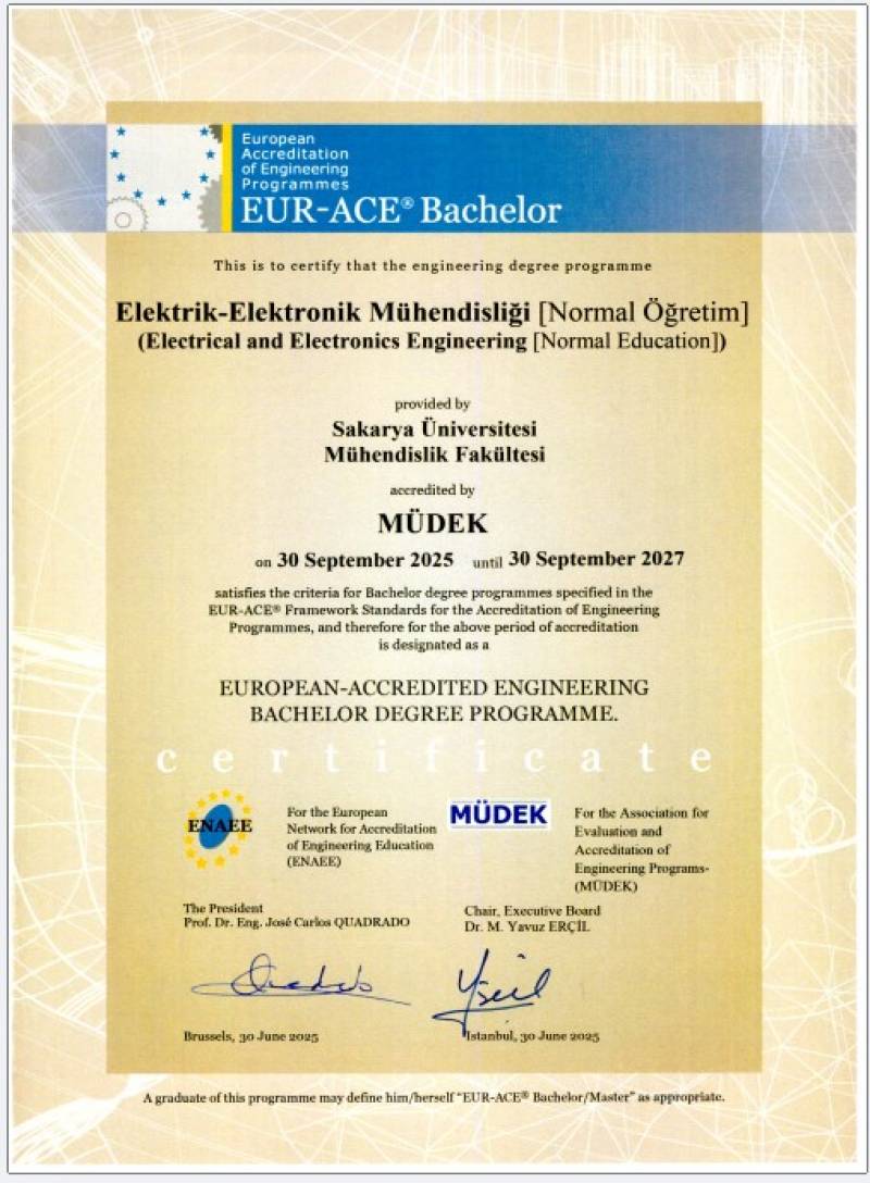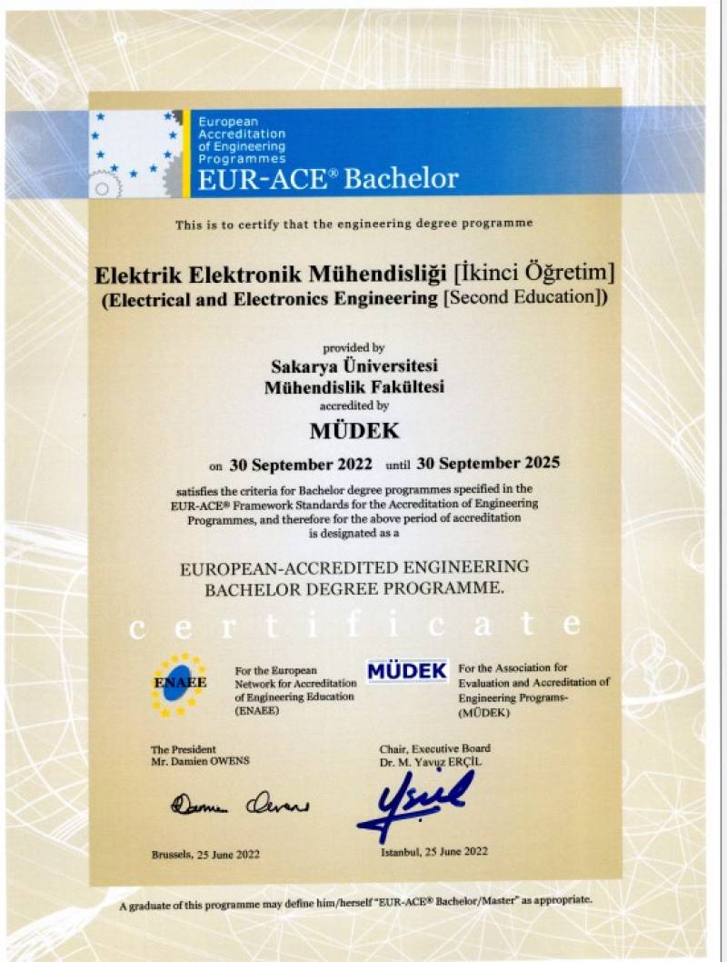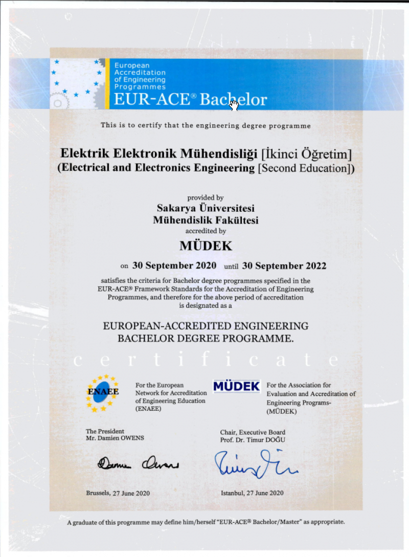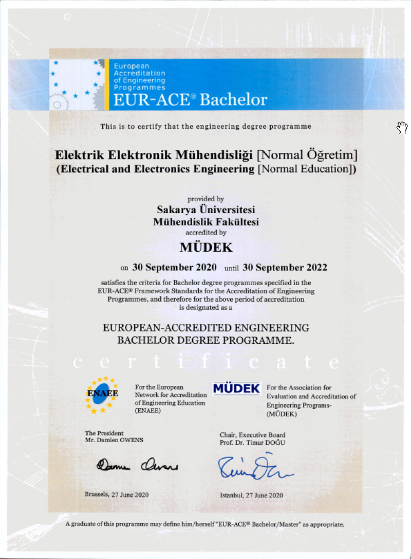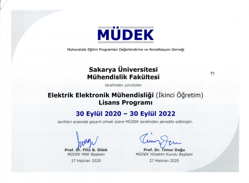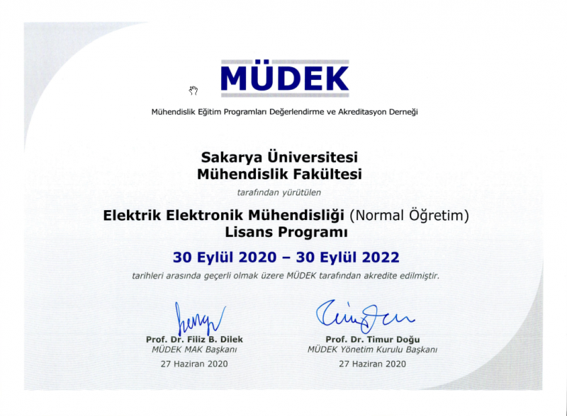 Bölümümüz 2010-2015 yılları arasında Müdek tarafından akredite edilmiş olup bölümümüzün akreditasyon yenileme çalışmaları kapsamında özdeğerlendirme raporlarımız hazırlanmış ve Müdek denetmenleri tarafından bölümümüze yapılan ziyaretler ve değerlendirmeleri sonucunda Müdek Akreditasyonu Geçerlilik Süresi ve EUR-ACE Etiketi Geçerlilik Süresi 30.09.2025 tarihi olarak güncellenmiştir.